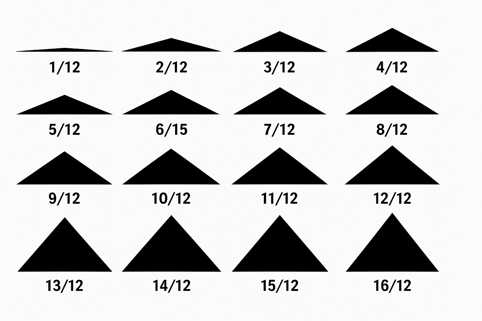 To determine the pitch of your roof, we need a general idea of how steep the slope is. Check out the graphic below for common roof pitches, and let us know which one best matches your home.